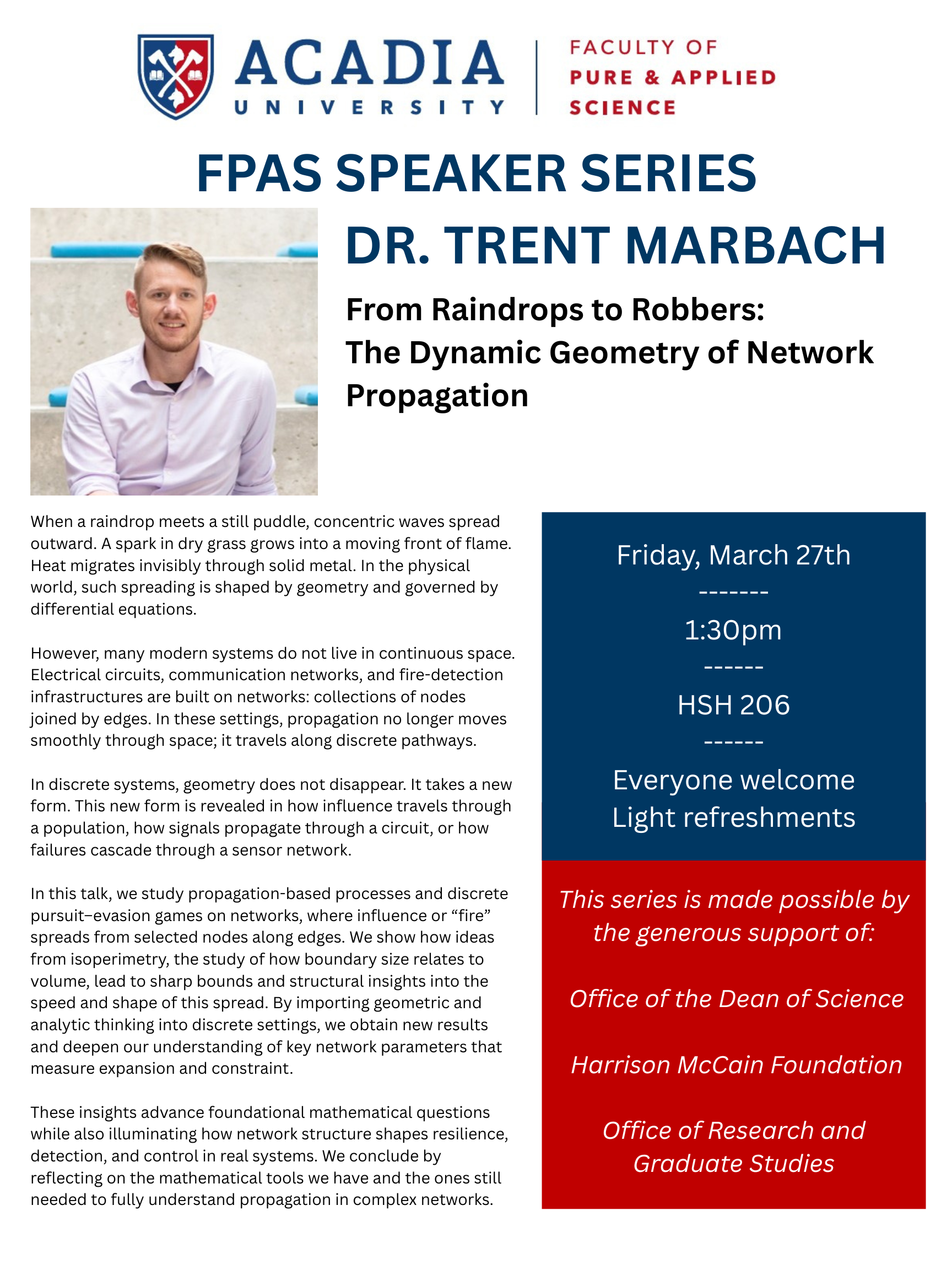 Math and Stats Seminar - From Raindrops to Robbers: The Dynamic Geometry of Network Propagation - Presented by Dr. Trent Marbach